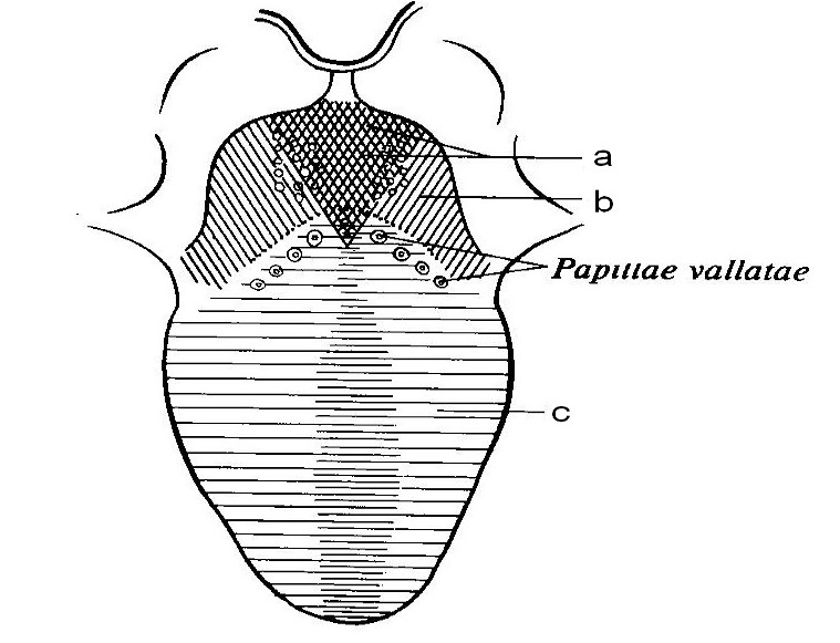 Poniżej przedstawiono schemat unerwienia języka. Proszę podać nazwy nerwów zaopatrujących wskazane obszary (a, b i c) języka.