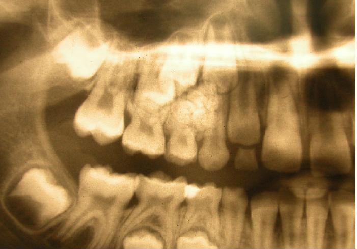 Chory, lat 32, zgłosił się z powodu silnych dolegliwości bólowych, obrzęku części zębodołowej żuchwy strony lewej oraz podwyższonej ciepłoty ciała. W badaniu klinicznym po lewej stronie żuchwy stwierdzono obecność tkliwego guza, rozchwianie zębów oraz parestezje nerwu żuchwowego. Na wykonanych radiogramach zaobserwowano ognisko osteolizy o niewyraźnie zaznaczonych brzegach, bez cech otoczki osteosklerotycznej ani torebki. Odnotowano cechy niszczenia z jednoczesnym nowotworzeniem kości oraz zmiany w okostnej w postaci „łusek cebuli” i trójkątów Codmana. W surowicy krwi chorego stwierdzono podwyższony poziom fosfatazy zasadowej. Powyższe dane pozwalają na postawienie wstępnego rozpoznania: