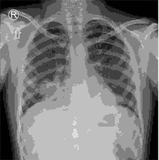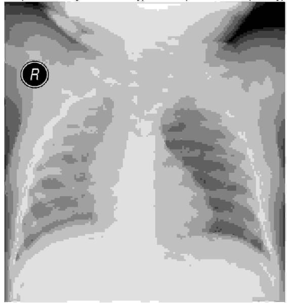 U niechorującego dotychczas 2,5-letniego chłopca nastąpiło bardzo gwałtowne pogorszenie stanu klinicznego (w tym wystąpienie duszności) w trakcie wirusowej infekcji górnych dróg oddechowych. W udziale zamieszczonego RTG klatki piersiowej ustal wstępne rozpoznanie i postępowanie:
