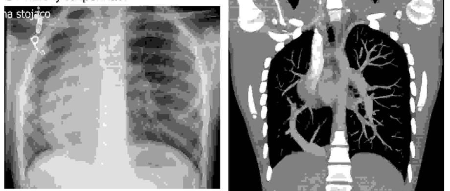 Na podstawie zamieszczonych poniżej RTG klatki piersiowej oraz angio-CT należy rozpoznać: