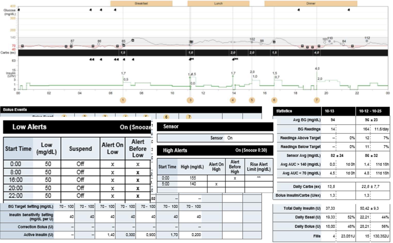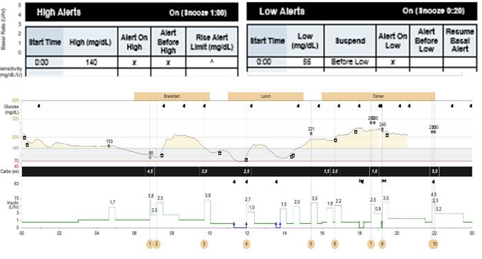 Pacjent 12-letni, chory na cukrzycę typu 1 od 3 lat, leczony insuliną podawaną pompą insulinową, HbA1c 7,4%. Na wizycie kontrolnej odczytano dane z pompy insulinowej Medtronic MiniMed Paradigm Veo. Co należy zalecić?