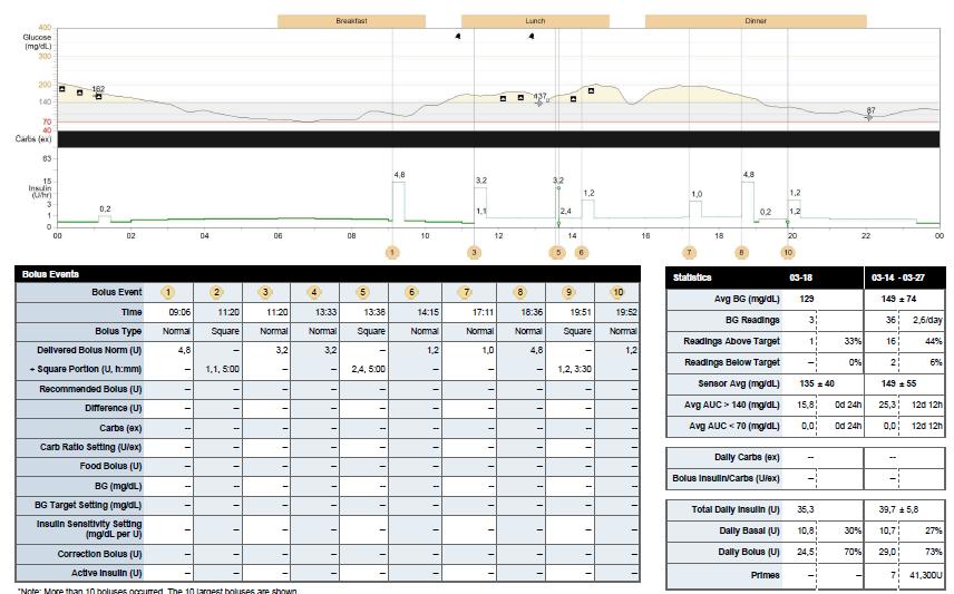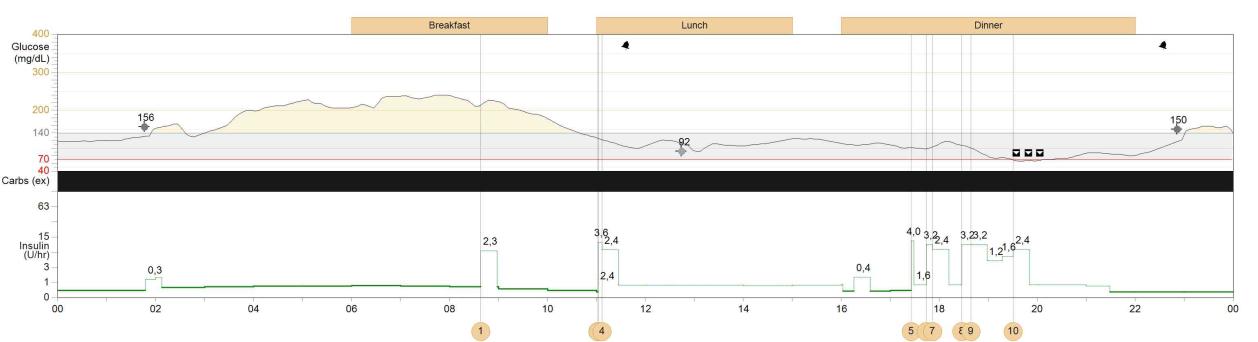 Pacjentka 17-letnia chora na cukrzycę typu 1 od 10 lat podłączyła pompę insulinową MiniMed 640. Po sczytaniu danych z pompy insulinowej stwierdzono, że średnia glikemia wynosi 96 ± 23 mg/dl, HbA1c 4,6%. Po analizie odczytu z pompy insulinowej należy zalecić pacjentce: