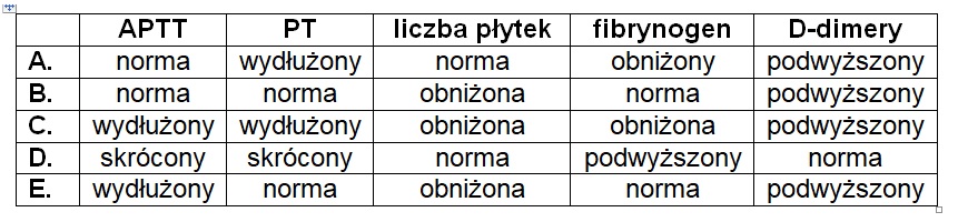 U 70-letniego pacjenta podczas kwalifikacji do zabiegu operacyjnego raka prostaty dwukrotnie stwierdzono znacznie przedłużony czas częściowej tromboplastyny po aktywacji (APTT) odpowiednio do 150 sek i 180 sek (norma do 36 sek), natomiast czas protrombinowy i czas trombinowy były prawidłowe. Dotychczas bez klinicznych objawów zburzeń krzepnięcia. W wywiadzie liczne zabiegi operacyjne, w tym endoprotezoplastyka stawu biodrowego bez powikłań krwotocznych. Potwierdzono przedłużony APTT z dodatnim testem korekcji. Na podstawie obrazu klinicznego i dotychczasowych badań najbardziej prawdopodobnym rozpoznaniem jest: