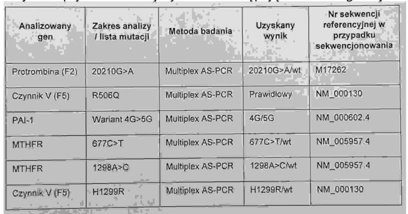 U 30-letniej kobiety, u której doszło do zakrzepicy żył głębokich powikłanej zatorowością płucną po 2 miesiącach stosowania doustnej antykoncepcji hormonalnej, wykonano następujące badania genetyczne. Wskaż prawidłową interpretację wyniku: