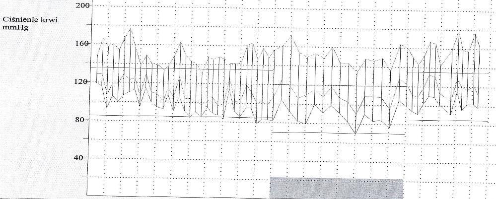 Pacjent l. 33, palacz tytoniu, otyły, informatyk prowadzący stresujący tryb życia, mało aktywny fizycznie, z obciążającym wywiadem rodzinnym w kierunku nadciśnienia tętniczego i choroby wieńcowej, zgłasza się do lekarza z powodu kłujących dolegliwości bólowych w klatce piersiowej. Wykluczono ich kardiogenną etiologię, ale w toku diagnostyki stwierdzono w EKG cechy przerostu lewej komory serca, hiperlipidemię mieszaną i podwyższony poziom glukozy na czczo. Ciśnienie tętnicze zmierzone w gabinecie wynosiło 132/88 mmHg (średnia z dwóch pomiarów). Pacjenta skierowano na 24-godzinną rejestrację ciśnienia, w której stwierdzono dobową średnią ciśnienia 136/90 mmHg, średnią z okresu dnia 142/89 mmHg i z okresu nocy 122/81 mmHg. U tego pacjenta należy rozpoznać: