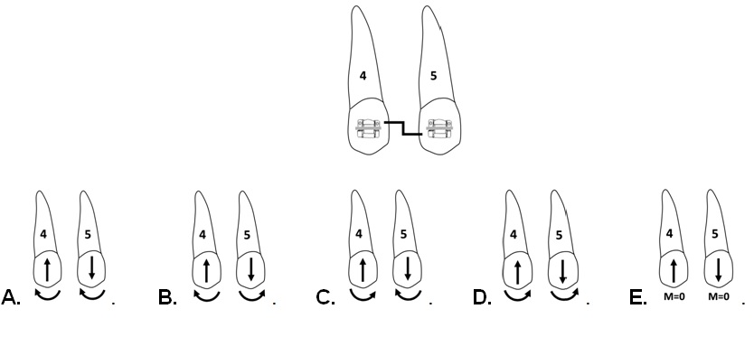 Wskaż prawidłowy układ sił działających na zęby 4 i 5, jaki powstanie po wprowadzeniu między nie zagięcia schodkowego (step bend) pokazanego na rysunku: