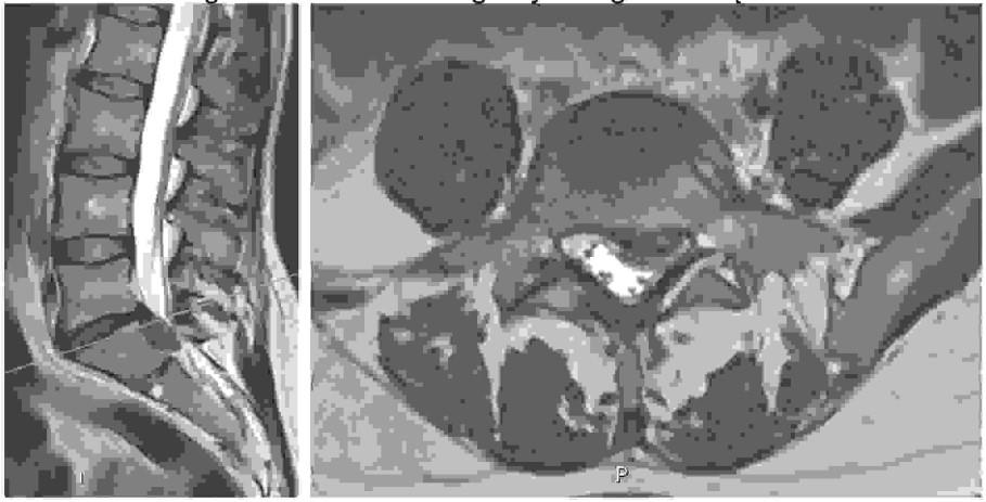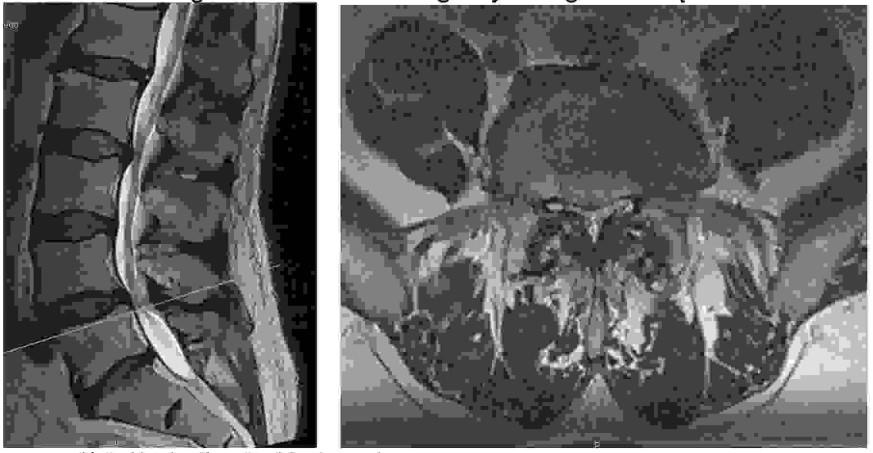 Do charakterystycznych objawów patologii widocznej na poniższych obrazach tomografii rezonansu magnetycznego należą: 1) ból okolicy lędźwiowej, 2) parestezje, ból promieniujący do kończyn dolnych w pozycji stojącej podczas chodzenia, 3) osłabienie siły zgięcia stawu biodrowego, 4) osłabienie odruchu kolanowego, 5) zmniejszenie dolegliwości bólowych promieniujących do kończyn dolnych po przyjęciu pozycji siedzącej.