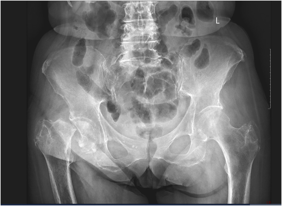 75-letnia chora została przywieziona przez zespół ratownictwa medycznego do Szpitalnego Oddziału Ratunkowego. Lekarz dyżurny zlecił wykonanie radiogramu (poniżej) oraz konsultację specjalisty w dziedzinie ortopedii i traumatologii narządu ruchu.