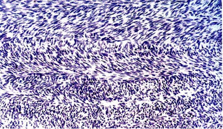Zaprezentowane na zdjęciu histologiczne utkanie nowotworu określane jest w patomorfologii mięsaków tkanek miękkich terminem: