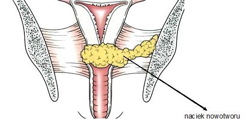 Podczas zabiegu operacyjnego stwierdzasz u chorej na raka jajnika zmiany nowotworowe na odbytnicy (jak na rysunku) potwierdzone badaniem mikroskopowym. Oceń stopień klinicznego zaawansowania według klasyfikacji FIGO: