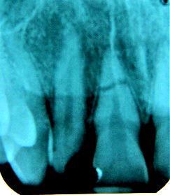 23-letni pacjent zgłosił się po urazie zęba 11 do gabinetu stomatologiczne- go. Obraz uzyskany w badaniu rtg zaprezentowano na załączonej rycinie. Na podstawie powyższych informacji wskaż optymalne postępowanie terapeutyczne: