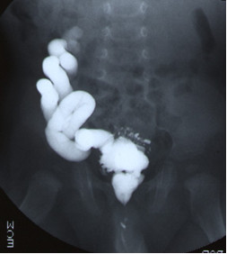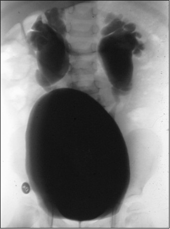 Dziewczynka 1-miesięczna po operacji przepukliny oponowo-rdzeniowej z zakażeniem układu moczowego, została przyjęta do oddziału pediatrycznego. Po wyleczeniu zakażenia stwierdzono podwyższenie poziomu kreatyniny do 1 mg%, w badaniu USG poszerzenie układów kielichowo-miedniczkowych i moczowodów. Badanie urodynamiczne wykazało zmniejszoną podatność pęcherza z ciśnieniem powyżej 160 cm H2O pod koniec wypełniania. Wynik cystografii mikcyjnej na załączonym obrazie. Najbardziej optymalnym sposobem leczenia będzie: