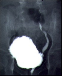 Dziewczynka 7-letnia, leczona od dwóch lat z powodu moczenia dziennego towarzyszącego parciom naglącym, zgłosiła się do poradni urologii dziecięcej. W wywiadzie nigdy nie stwierdzono zakażeń układu moczowego. Badanie przedmiotowe i USG jamy brzusznej nie wykazało odchyleń od normy. Cystografia mikcyjna ujawniła obecność czynnego lewostronnego odpływu pęcherzowo-moczowodowego II stopnia, charakterystyczny obraz poszerzenia cewki moczowej w części środkowej (cewka w kształcie wrzeciona) i niewielkie zaleganie po mikcji. W pierwszej kolejności należy zaplanować: